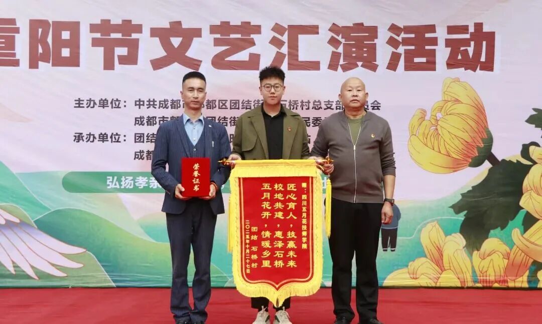 为进一步深化校地合作,赋能乡村振兴,10月27日,四川五月花技师学院团委书记杨家奇带领学院五月阳光舞蹈团前往郫都区团结街道石桥村,参加由中共成都市郫都区团结街道石桥村总支部委员会、成都市郫都区团结街道石桥村村民委员会联合主办的“孝满石桥·艺暖重阳”重阳节文艺汇演活动。表演结束后,他们收到了石桥村“两委”向学院赠送的锦旗。